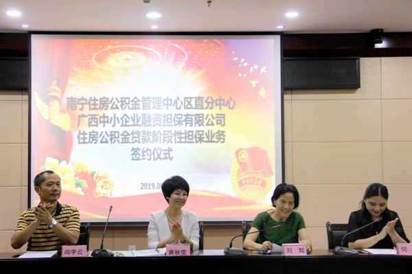 2019年8月21日,金投集團下屬廣西中小企業(yè)融資擔保公司(以下簡稱擔保公司)與南寧住房公積金管理中心區(qū)直分中心(以下簡稱區(qū)直公積金中心)舉行住房公積金貸款階段性擔保業(yè)務簽約儀式。擔保公司副總經(jīng)理黃秋雯與區(qū)直公積金中心副主任劉輝分別代表雙方在儀式上簽約。